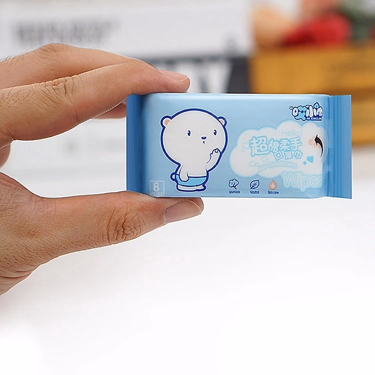 Qui cách: 1 bịch 8 gói nhỏ – 1 gói nhỏ 8 khăn giấy ướt mini