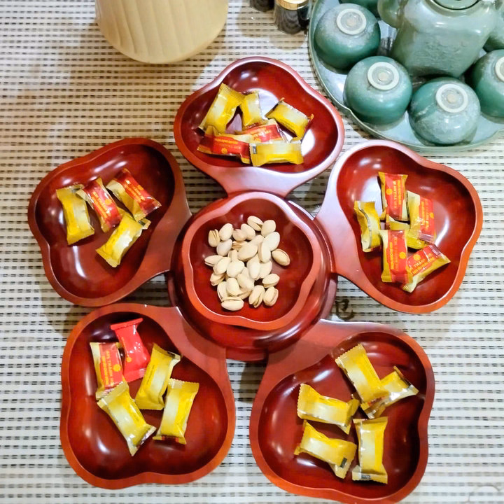 Độc đáo, lạ mắt: Thiết kế hình ảnh hoa mai độc đáo, khác biệt với những mẫu khay đựng bánh mứt thông thường, tạo điểm nhấn ấn tượng cho không gian.