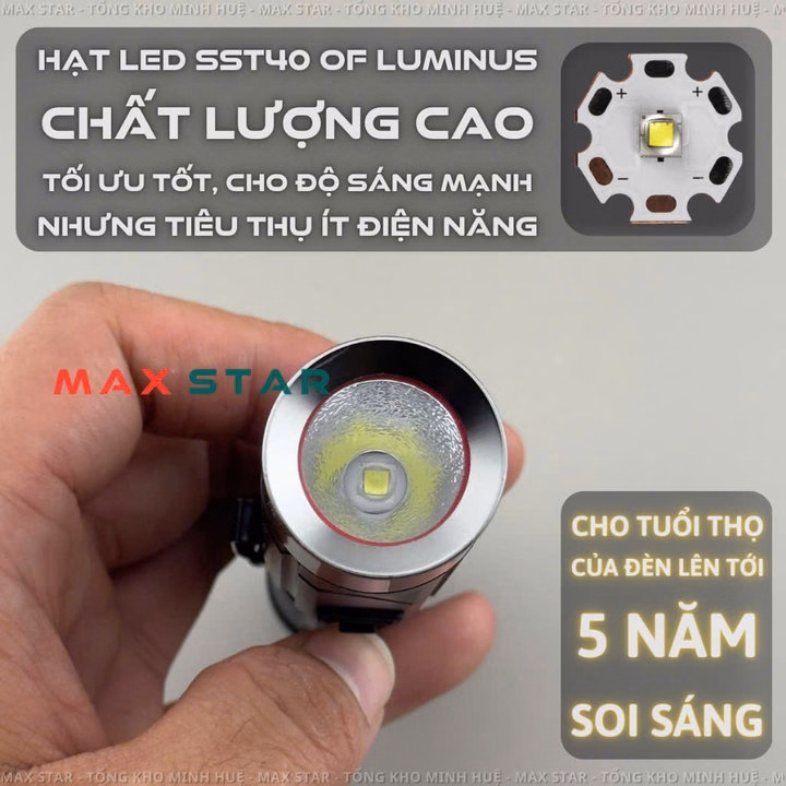 ✔ Led Luminus Sst-40 cao cấp siêu sáng siêu bền, tối ưu tốt, cho độ sáng mạnh nhưng tiêu thụ ít điện năng cho tuổi thọ của đèn lên tới 5 năm soi sáng.