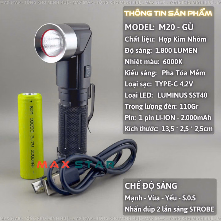 Đèn pin cầm tay mini siêu sáng Max Star M20 vỏ nhôm chống nước Ipx7 chip led Sst40 chống nước Ipx7 soi sáng liên tục ~5 Gd229