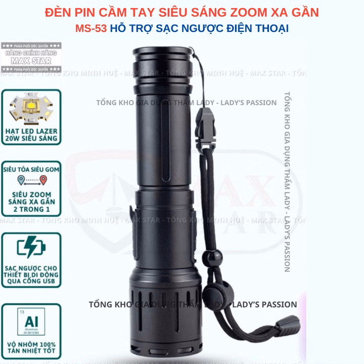 Đèn Pin Cầm Tay Ms53 Siêu Sáng Zoom Xa Gần Tích Hợp Sạc Ngược Cho Điện Thoại Chống Nước Ipx5 Gd201 – Lady’S Passion