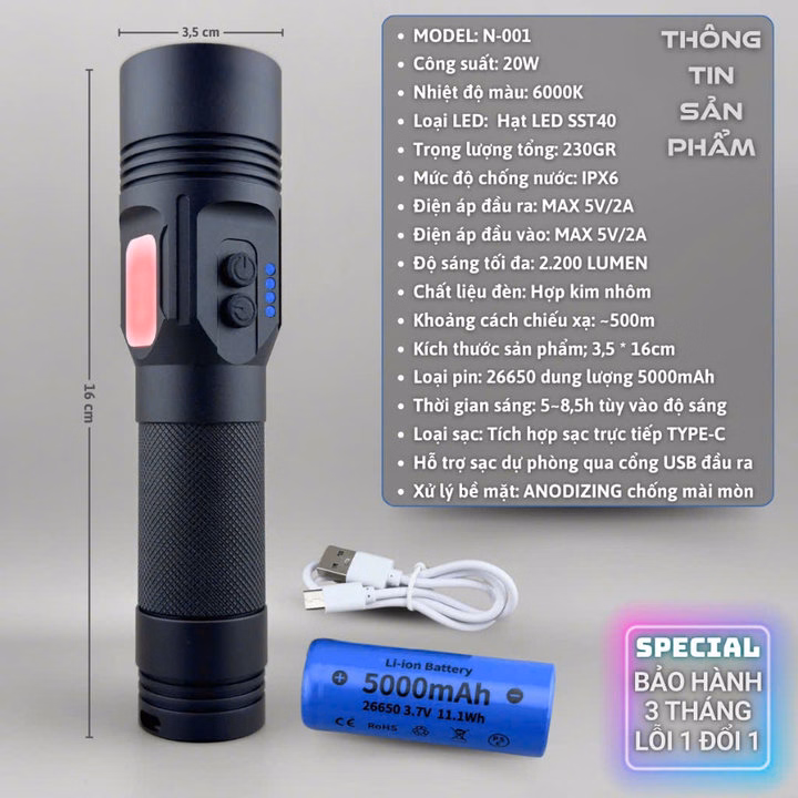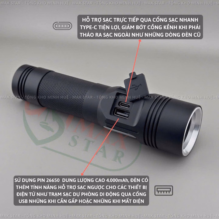 ✔ Sử dụng pin 26650 dung lượng cao 4.000mah, đèn có thêm tính năng hỗ trợ sạc ngược cho các thiết bị điện tử như trạm sạc dự phòng di động qua cổng usb những khi cần gấp hoặc những khi mất điện