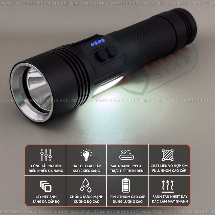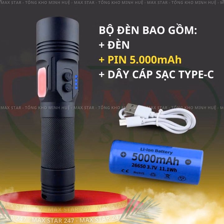 Đèn pin cầm tay siêu sáng cao cấp Max Star N001 Led Sst40 chính hãng pin trâu sạc ngược chân cáp sạc nhanh Typec Gd225