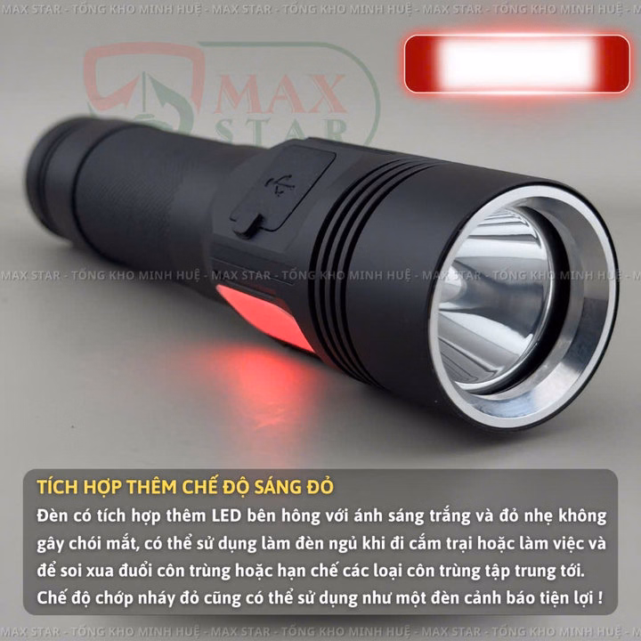 ✔ Tích hợp thêm chế độ sáng đỏ: đèn có tích hợp thêm led bên hông với ánh sáng trắng và đỏ nhẹ không gây chói mắt, có thể sử dụng làm đèn ngủ khi đi cắm trại hoặc làm việc và để soi xua đuổi côn trùng hoặc hạn chế các loại côn trùng tập trung tới, chế độ chớp nháy đỏ cũng có thể sử dụng như một đèn cảnh báo tiện lợi !
