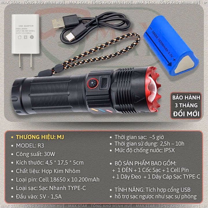Đèn pin cầm tay siêu sáng Mj R3 zoom sáng soi gom tỏa xa gần pin trâu chống nước vỏ nhôm chất lượng cao Gd223