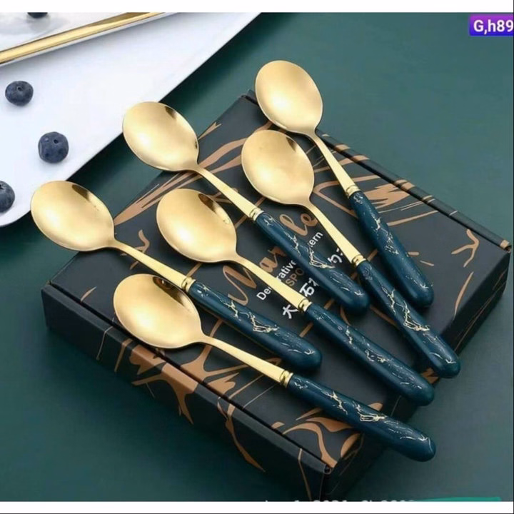 Hộp 6 Thìa inox mạ vàng cán xanh đế vân đá sang trọng, Muỗng inox giá rẻ không gây di ứng an toàn khi sử dụng
