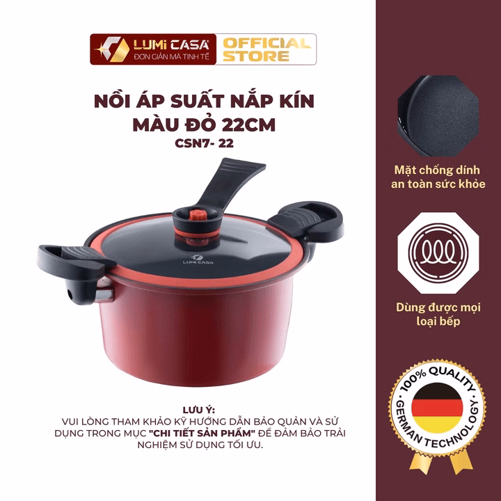 Nồi Áp Suất Thép Carbon 22cm Nắp Kín Màu Đỏ Công Nghệ Đức – Chống Dính Cao Cấp, An Toàn Cho Sức Khỏe