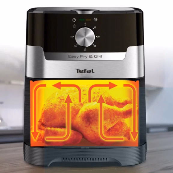 Thay vì chỉ dùng một luồng khí nóng như các nồi chiên không dầu thông thường, Nồi chiên không dầu Tefal Ey501d15 được trang bị công nghệ khí nóng đa chiều với nhiều luồng khí nóng di chuyển với nhiều quỹ đạo khác nhau. Nhờ thế, luồng nhiệt có thể chạm đến nhiều góc độ của món ăn hơn, khiến cho mọi mặt của món ăn đều được chín vàng giòn xốp mà bên trong vẫn mềm và mọng nước.